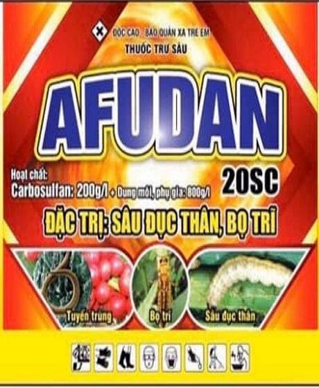 CÔNG DỤNG:AFUDAN 20SC là thuốc trừ sâu dạng dầu, hòa tan hấp thụ tốt và loang trái đều. Thuốc có tác động lưu dần, tiếp xúc và vị độc cực mạnh. Phòng trừ rộng, đặc trị các loại sâu, sâu đục thân, bọ trĩ khó trị trên các loại cây trồng.THÀNH PHẦN:Carbosulfan 200g/lDung môi, phụ gia 800g/lHƯỚNG DẪN SỬ DỤNG:Lúa (sâu đục t